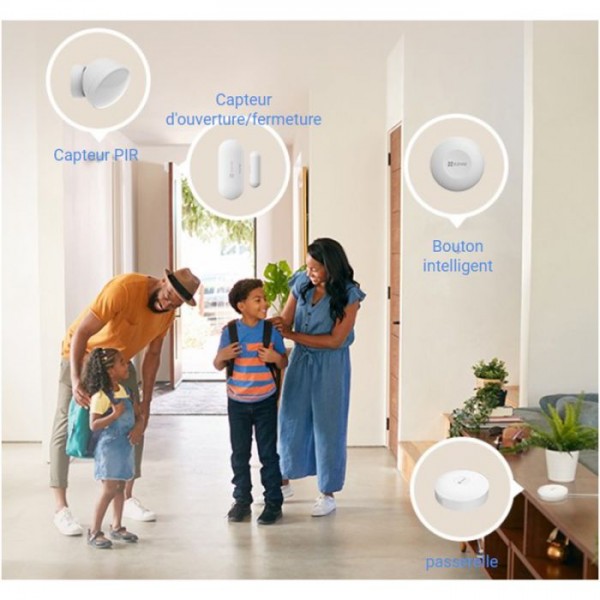 Kit De Capteurs Domestiques EZVIZ CS-B1 - Comprend: Passerelle domestique, Capteur PIR, Capteur d'ouverture/fermeture, Bouton intelligent - Alertes mobiles instantanées sur les détections - Rappel de batterie faible - Alarme anti-effraction - Conception économe en énergie avec une longue durée de vie de la batterie (Jusqu'à 2 ans) - Configuration et contrôle faciles via l'application EZVIZ - Appairage facile - Connectivité: Wi-Fi 2,4 GHz, ZigBee 3.0, interface RJ45 - Distance de communication: Wi-Fi (2,4 GHz) < 200 m, ZigBee 3.0 < 200 m - Type de détection: Infrarouge passif (PIR) - Distance de détection: Jusqu'à 7m/23pi - Angle de détection: 90° horizontal, 90° vertical - Hauteur d'installation recommandée: 1,8 à 2,5 m pour une installation murale - Distance de déclenchement recommandée: Porte en bois > 25 mm, Porte en fer > 15 mm - Détection à l'épreuve des animaux: Nécessite l'utilisation du bouclier pour animaux de compagnie et une hauteur d'installation de 50 cm ou plus au-dessus de l'animal - Intégration intelligente avec les caméras EZVIZ - Installation à décoller et à coller - Conditions de fonctionnement: -10 °C à 55 °C, humidité 95 % ou moins (sans condensation) - Dimensions: Φ 70,0 × 25,4 mm (Φ 2,75 × 1,00 pouces) - Poids: 71 g