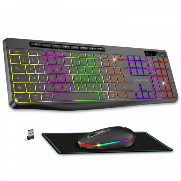 Clavier : sans fil 118 Touches "Low profile" - 10 touches spéciales mumltimédia - 12 raccourcis multimédia - Technologie sans fil RF 2.4 GHz - Antighosting Rollover 4 touches - Batterie lithium rechargeable 1000 mAh - Norme AZERTY - Hauteur du clavier réglable 1 position - Indicateur LED Batterie - Indicateurs LED - Mode économie d'énergie (On/Off) - Patins silicone - Rétro-éclairage RGB Rainbow - Touches silencieuses - Waterproof IPX4 - Souris : 4 Boutons + Molette de défilement 4 - Batterie lithium rechargeable 500 mAh - Capteur optique 1600 DPI max - Clics souris silencieux - Résolution réglable - Technologie sans fil RF 2.4 GHz - Rétroéclairage RGB 15 effets + 7 Couleurs - Compatibilité Windows et Mac - Contenu de l'emballage - Clavier + Souris + Tapis R-Type + Câbles USB Nano récepteur USB - Couleur Noir - Garantie 1 an